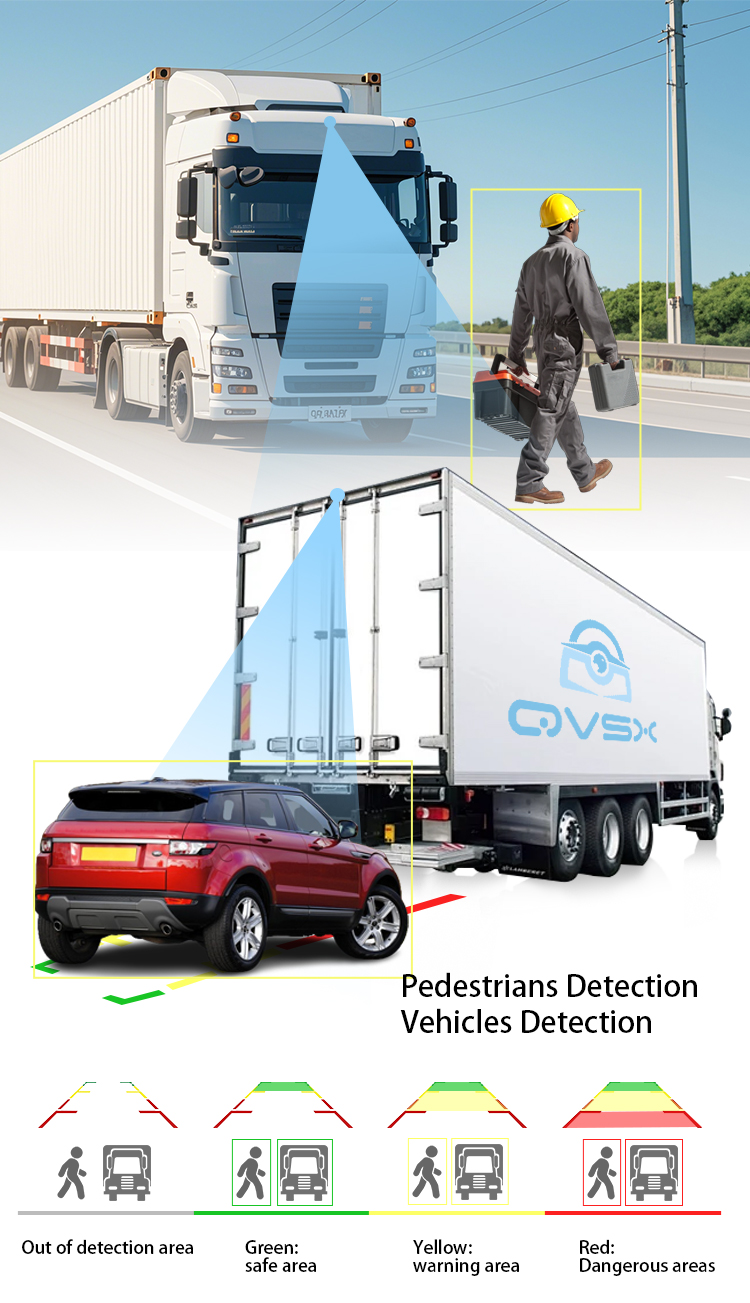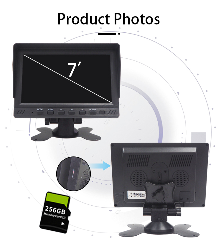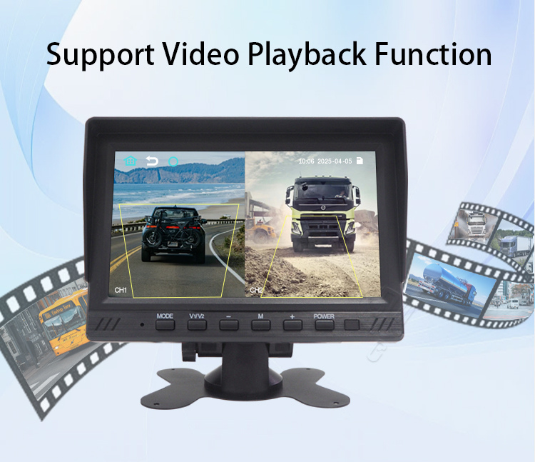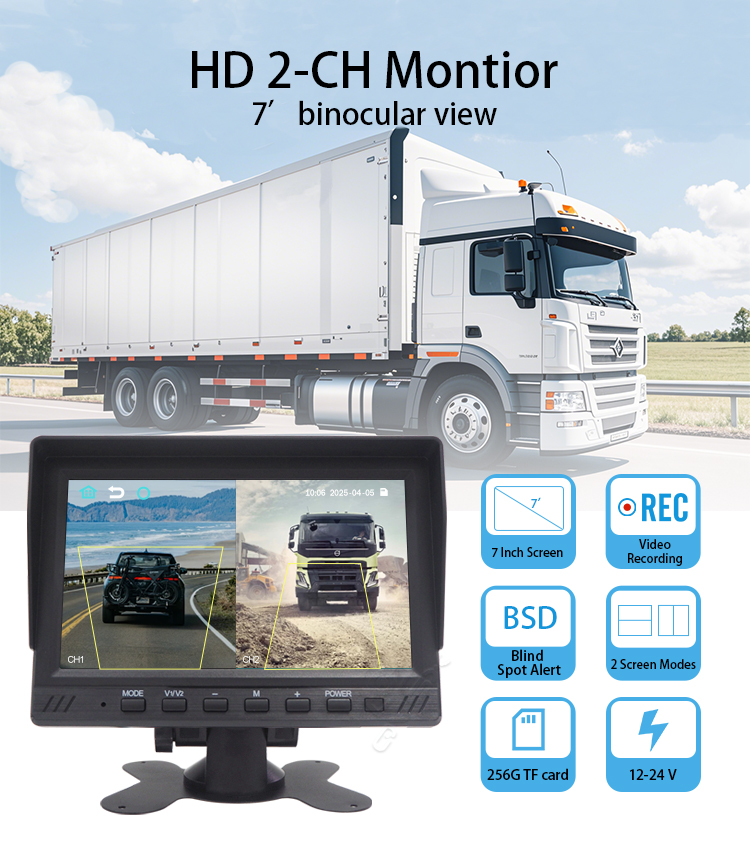 7 inch 2-CH BSD monitor, support 12 - 24V voltage, adapt to a variety of scenes. Equipped with pedestrian and vehicle warning function, effectively protect travelling safety. It has 2 flexible screen division modes, which can be switched according to the demand and present different screen information at the same time. Capable of video playback, supports up to 256G TF card, massive storage, no need to worry aboutinsufficient storage space. Applications: ldeal for buses, coaches, delivery vehicles, construction trucks, forklift trucks andmore.